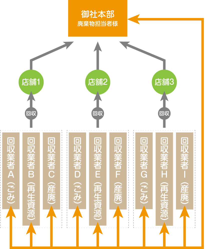廃棄物一元管理とは 従来の状況 複数業者とのやり取りが必要。そのため多くの時間を要する… 画像クリックで拡大表示できます! 一括管理でスリム化 従来の複数業者から一本化することで、業務の簡素化!! 画像クリックで拡大表示できます!